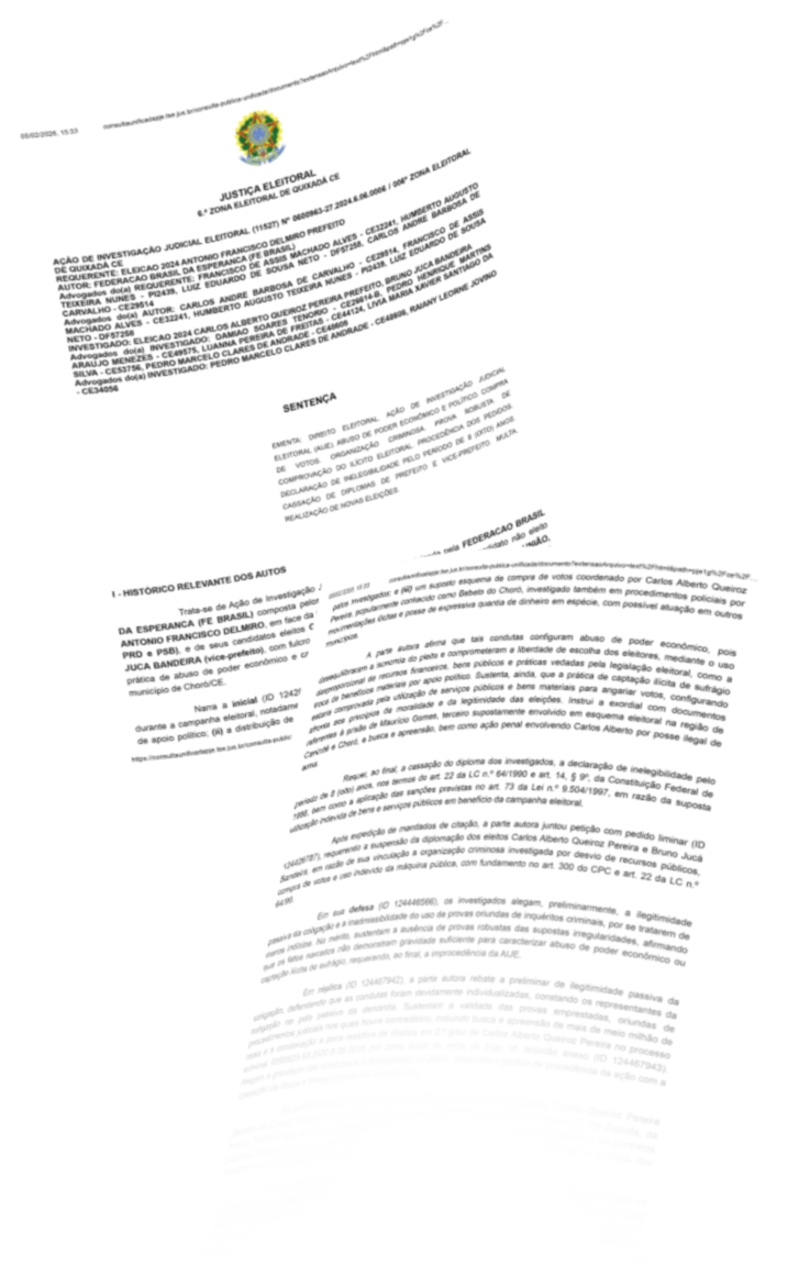 EMENTA: DIREITO ELEITORAL. AÇÃO DE INVESTIGAÇÃO JUDICIAL ELEITORAL (AIJE). ABUSO DE PODER ECONÔMICO E POLÍTICO. COMPRA DE VOTOS. ORGANIZAÇÃO CRIMINOSA. PROVA ROBUSTA DECOMPROVAÇÃO DO ILÍCITO ELEITORAL. PROCEDÊNCIA DOS PEDIDOS. DECLARAÇÃO DE INELEGIBILIDADE PELO PERÍODO DE 8 (OITO) ANOS. CASSAÇÃO DE DIPLOMAS DE PREFEITO E VICE-PREFEITO. MULTA. REALIZAÇÃO DE NOVAS ELEIÇÕES.
